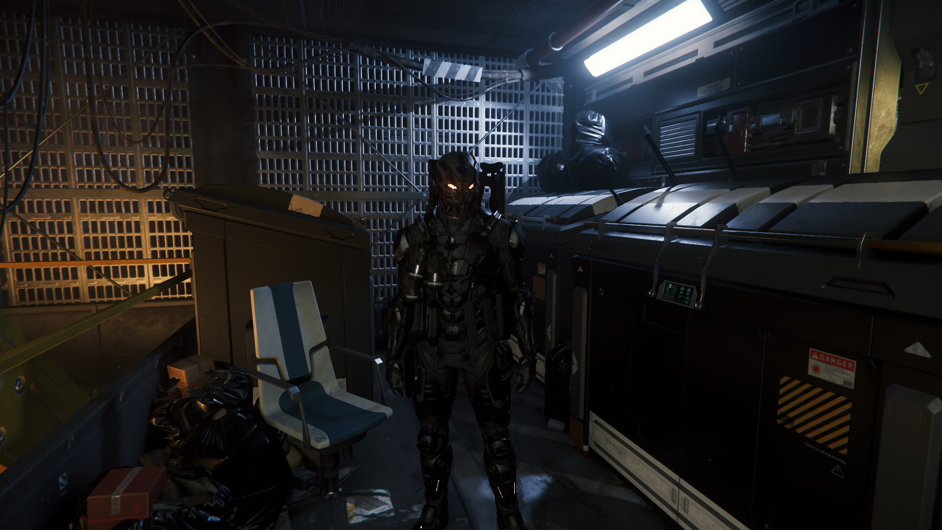 Über uns schlossen sich mit einem lauten Dröhnen die Hangartore und schlagartig wurde es dunkel. Persönlich finde ich das recht angenehm, da meine Augen nicht fürs Licht gemacht sind. Meine Pupillen weiteten sich und wir gingen forschen Schrittes richtung Aufzug.